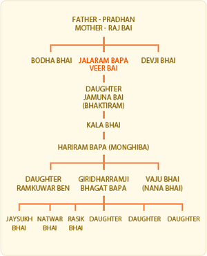 Bhagat Jalaram got married when he was only sixteen to Virbai. Virbai was the daughter of Thakar Pragji Somaiya. Although Jalaram was reluctant, Virbai proved to be an asset to Jalaram in his work. Virbai always helped Jalaram and supported and encouraged him. Without Virbai's support Jalaram would have found many difficulties in his path.